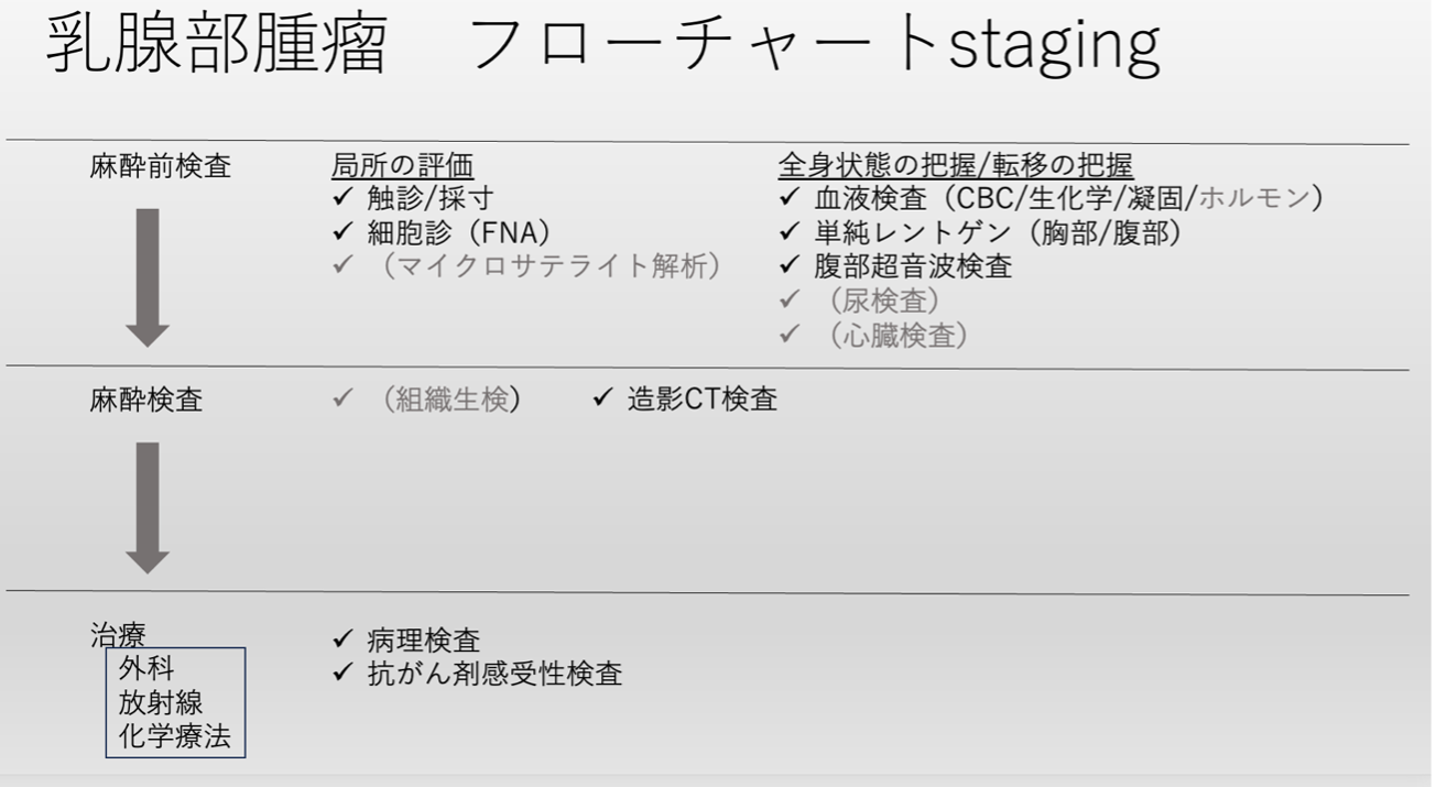乳腺腫瘍の評価には、局所制御と全身状態の両方を把握するための精査が必要です。