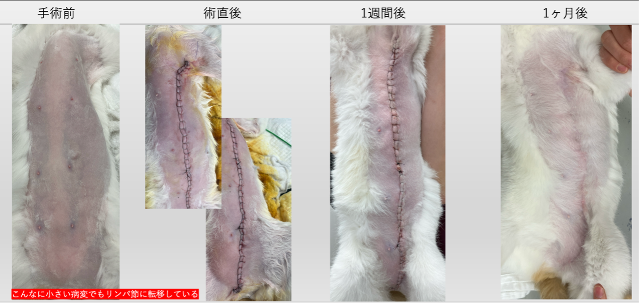 腫瘍径2cm以上・浸潤性の高い症例・猫では、広範囲切除(広いマージン確保)が予後改善に有効とされています。